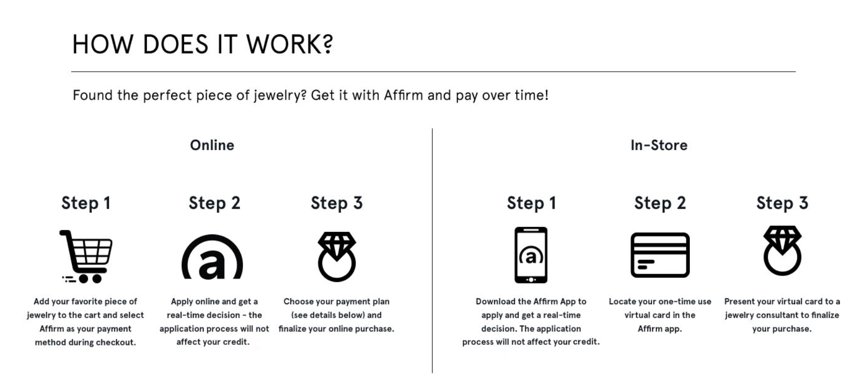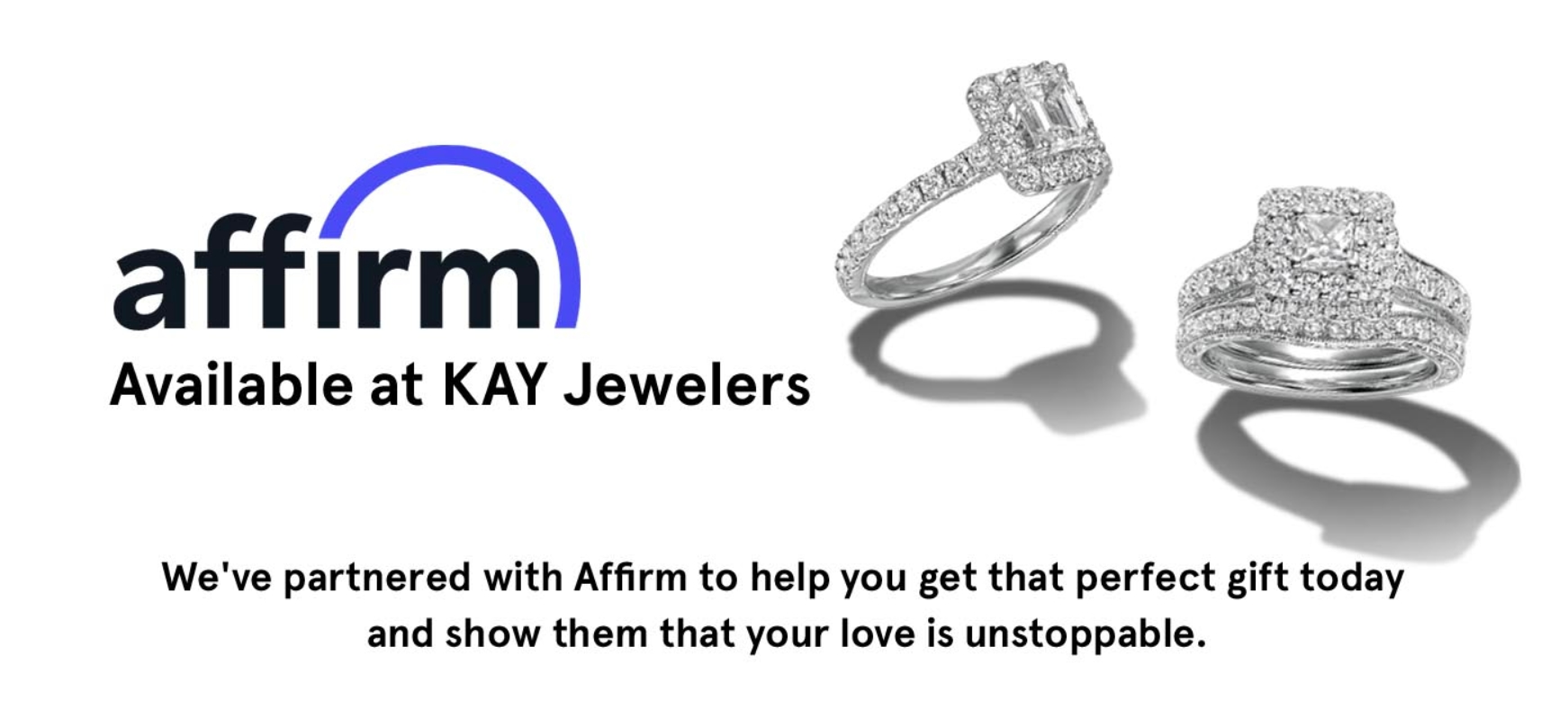 KAY Jewelers offers easy and affordable payments online and in stores with Affirm, a loan service provider, at a pace you choose from the available options. You can purchase immediately and pay over time. During checkout at KAY.com, you can choose Affirm as a payment method and apply for a loan to pay for your items. For in-store purchases, apply at affirm.com or download the Affirm app on your phone, pick your desired payment plan and present your digital card at the register. Affirm always shows you the exact terms (subject to your eligibility) and the total amount of interest you will pay, never charging you anything extra. Affirm does not charge any late fees, prepayment fees, annual fees, hidden fees, or service fees to open or close your Affirm account.