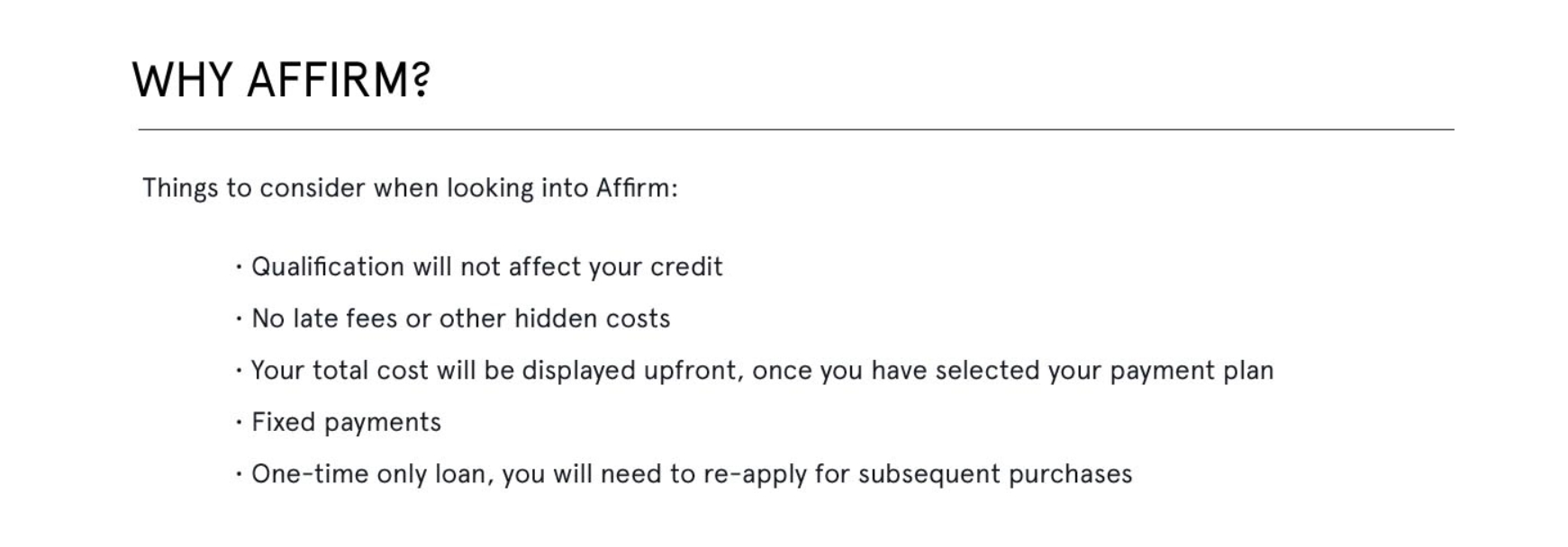 Affirm doesnāt charge late fees, service fees, prepayment fees, or any hidden fees. When you pay with Affirm, your annual percentage rate (APR) will be between 0 ā 36%. Affirm will show you up front the total amount of interest youāll pay and will never charge you a penny more.